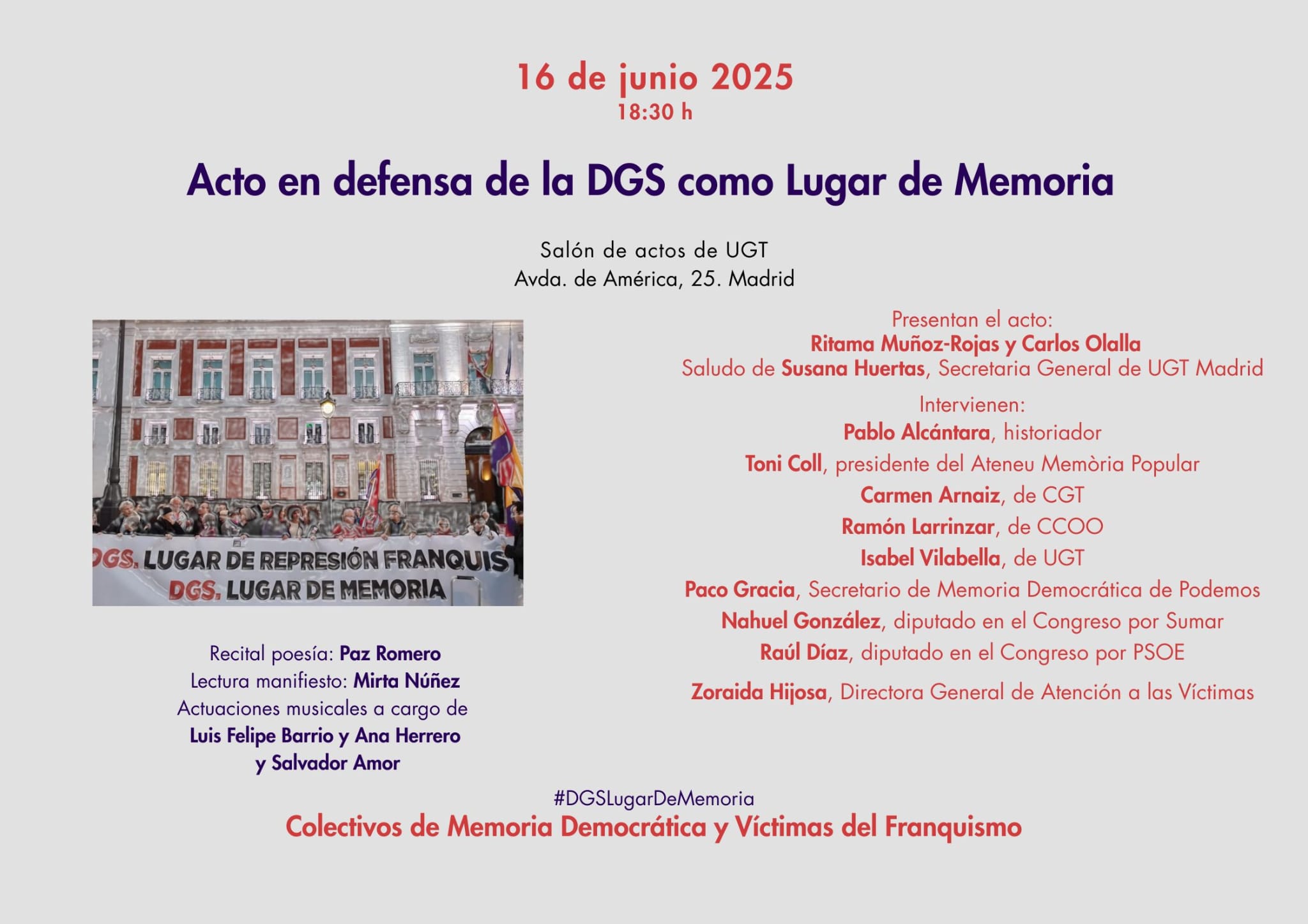 El pasado 16 de junio, en el salón de actos de la sede de UGT en avda. de América, se celebró un acto en defensa de que la antigua Dirección General de Seguridad (DGS) sea declarada Lugar de Memoria (#DGSLugarDeMemoria).