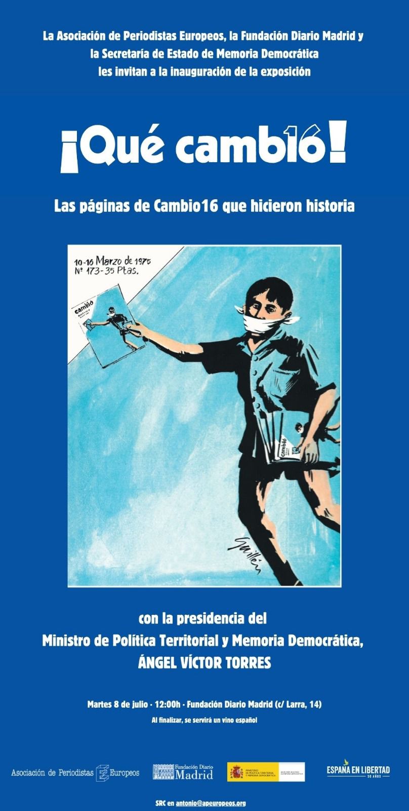 Ángel Víctor Torres, ministro de Política Territorial y Memoria Democrática, inauguró el pasado 8 de julio la exposición “¡Qué Cambio16! Las páginas de Cambio16 que hicieron historia”, en la sede de la Fundación Diario Madrid, Calle de Larra, 14.